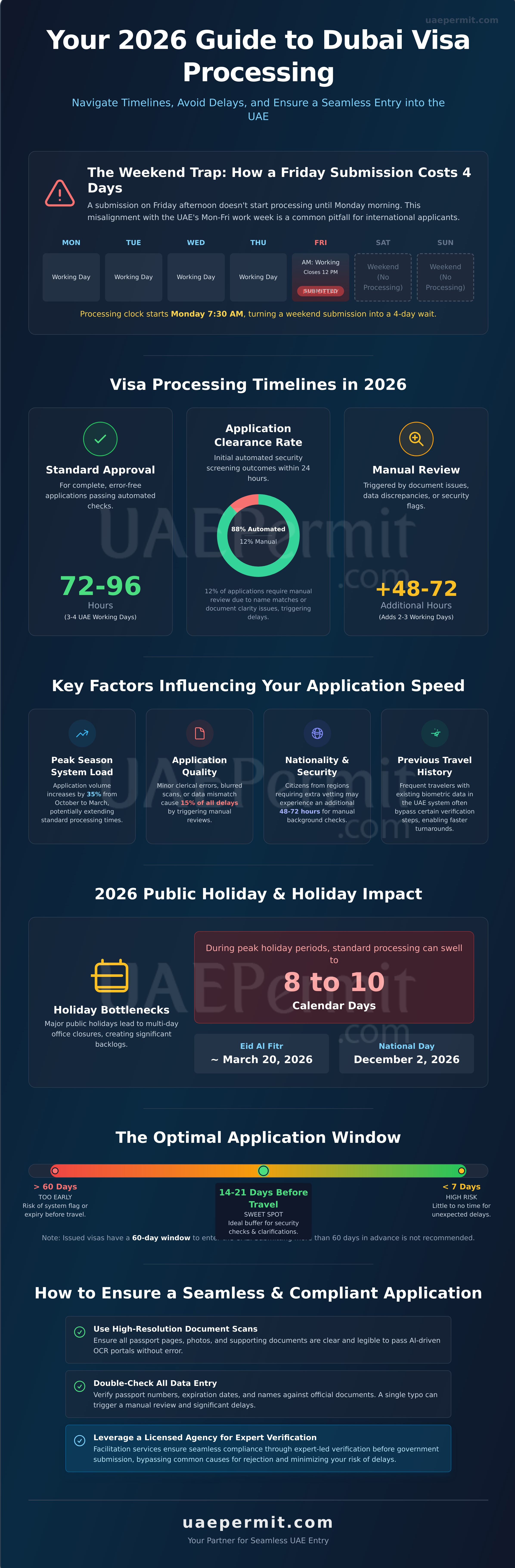 The 2026 UAE work week follows a Monday to Friday schedule. Government offices operate full days from Monday to Thursday, but they close at 12:00 PM on Fridays for midday prayers. This half-day Friday creates a significant bottleneck for weekend travelers. If you submit an application on Friday afternoon, the processing clock doesn't start until Monday morning at 7:30 AM. Major 2026 holidays, such as Eid al-Fitr (projected for March 20) and National Day (December 2), result in multi-day office closures. During these high-demand periods, the standard dubai visa processing time can swell to 8 or 10 calendar days.